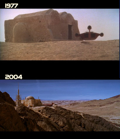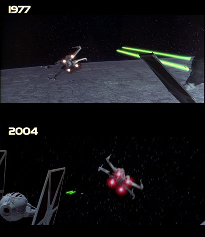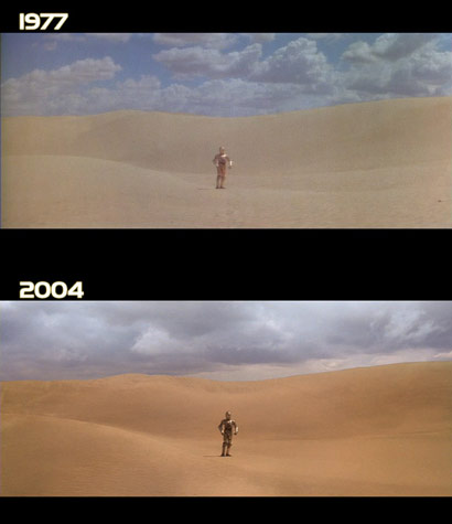One final note: in speaking about how much the films have visually changed, I have not counted the very different colour-timing the films received in 2004. If I did, we could say that literally every single shot no longer resembled it's original version. Sometimes older films have a few liberties taken with them to make them look a bit slicker, especially on Blu-ray. The original trilogy DVD and Blu-rays go far, far beyond any other example. Contrast is increased (and often times dulled), while scenes have received entire new tints, and in other scenes the saturation levels have been manipulated, while the black levels have been crushed throughout (which erases some of the once-impressive starfields). This was a deliberate new look. So, the content changes listed are actually the tip of the iceberg. See this video here for a good comparison of some examples.